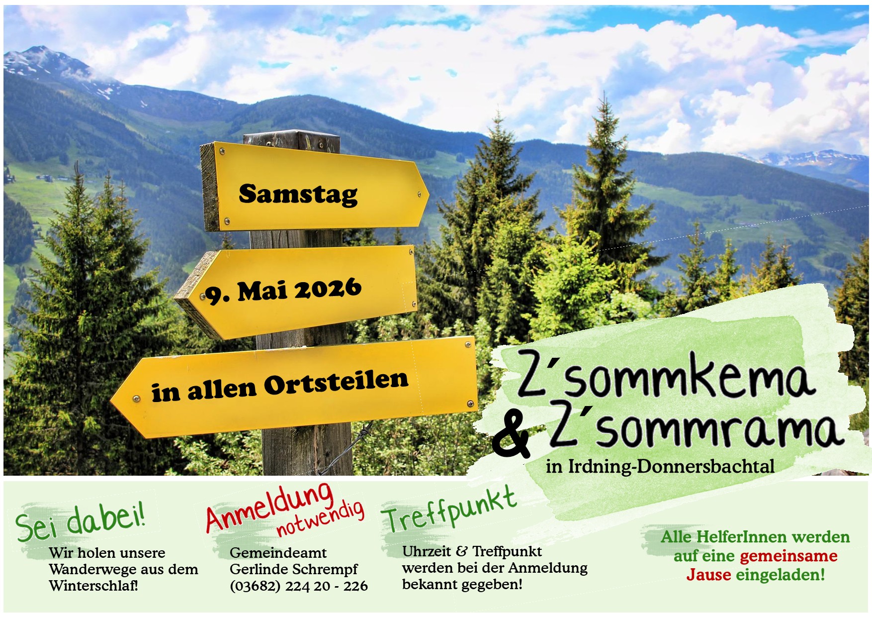 Im Rahmen eines Aktionstages werden wir auch heuer wieder unter dem Motto „Z´sommkema & Z´sommrama“ die Wanderwege in unserem Gemeindegebiet wieder fit für die Outdoor-Saison machen. Der Grundgedanke ist es, gemeinsam die wichtigsten Aufräumarbeiten nach dem Winter zu erledigen und eine „Ersterhebung“ durchzuführen, ob bei Wegen eine größere Sanierung notwendig ist. Zu den Arbeiten zählen: