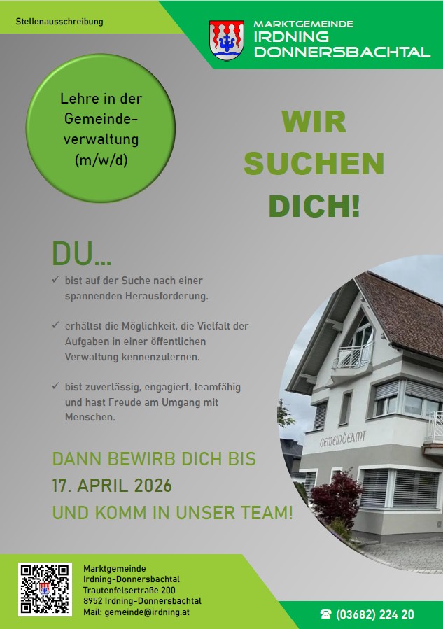 Die Marktgemeinde Irdning-Donnersbachtal schreibt die Lehrstelle eines Verwaltungsassistenten (w/m/i/d) für die Gemeindeverwaltung aus.